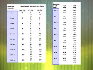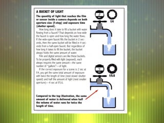 The document discusses how apertures work in cameras and affect photographs. It explains that apertures control both depth of field and the amount of light reaching the sensor. A large aperture gives a shallow depth of field while a small aperture gives a deep depth of field. Apertures are measured in f-stops, with smaller numbers representing larger apertures that allow more light. Understanding how to use different aperture and shutter speed combinations is key to great photography.