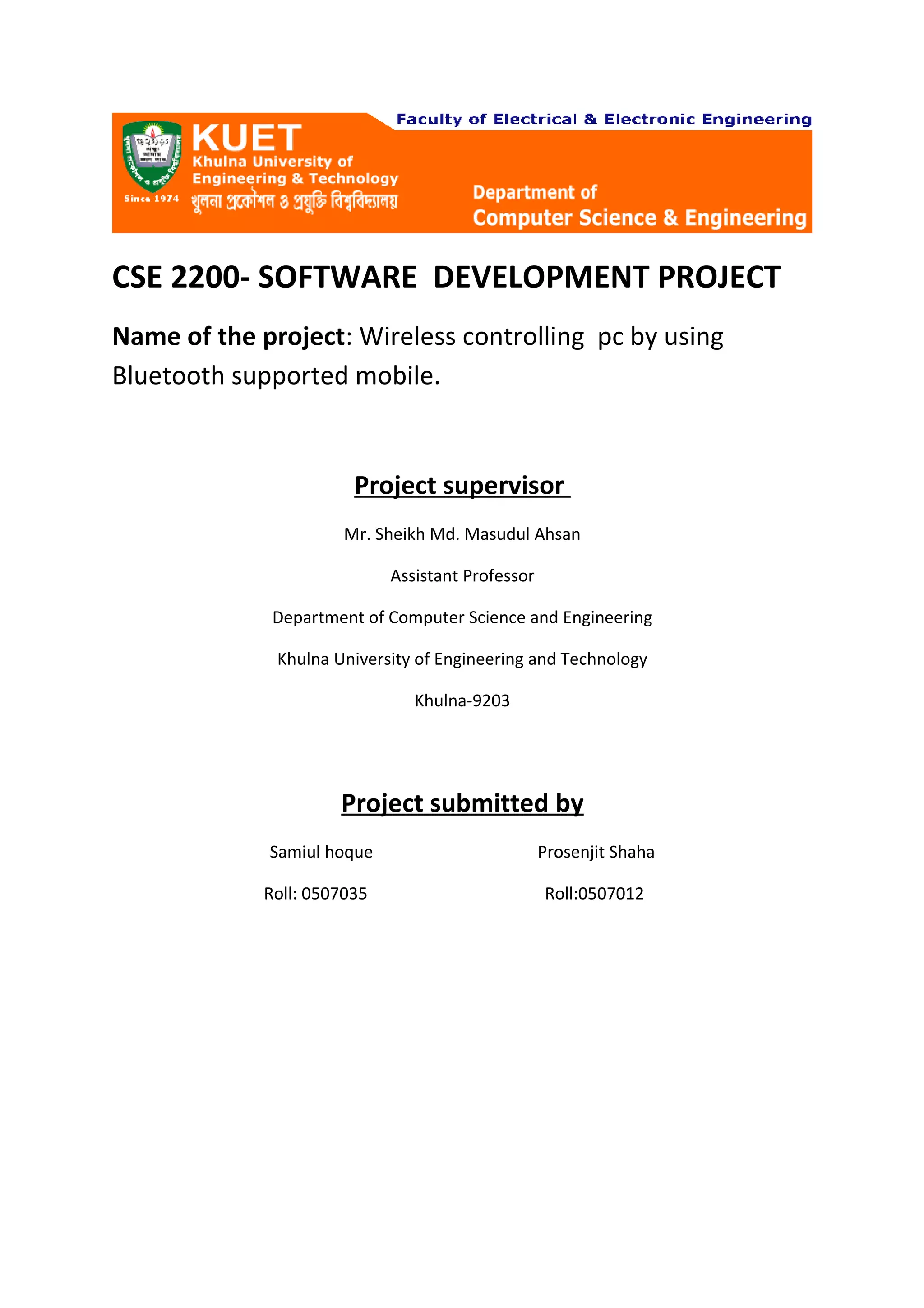 This document is a project report submitted by two students for their CSE 2200 software development project on creating a wireless application to control a PC using Bluetooth from a mobile device. The project aims to allow basic PC controlling operations and external device control. The report includes an introduction, objectives, descriptions of Bluetooth technology and protocols involved, the Java Bluetooth API, an overview of the client and receiver programs, and sections on device discovery, service discovery and communication.
