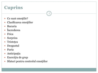 Documentul abordează conceptul emoțiilor, explicând natura și clasificarea acestora, inclusiv emoțiile fundamentale și complexe. Fiecare emoție este descrisă prin caracteristici specifice, manifestări fizice și tehnici pentru controlul acestora, cum ar fi frica, bucuria, tristețea și furia. De asemenea, oferă sugestii pentru gestionarea emoțiilor în situații de prezentare publică.