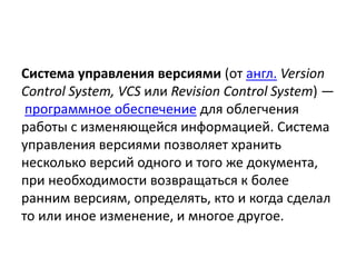 Документ описывает системы управления версиями (VCS), такие как Git, SVN и Mercurial, и их возможности, преимущества и недостатки. В нём рассматриваются основные функции VCS, включая хранение различных версий документов, управление ветками и журнал изменений. Кроме того, представлены инструкции по установке и настройке Git, а также использование различных команд для управления репозиториями.