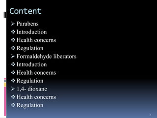 This document discusses controversial ingredients in cosmetics including parabens, formaldehyde liberators, and 1,4-dioxane. It outlines the common uses of these ingredients, potential health concerns like cancer and irritation, and regulations regarding their use. Parabens are widely used preservatives that may disrupt the endocrine system and have been linked to breast cancer. Formaldehyde and formaldehyde-releasing preservatives are found in many personal care products and are classified as carcinogenic. 1,4-dioxane is a probable carcinogen that can form as a contaminant in ingredients processed with ethylene oxide. Avoiding these ingredients requires reading labels and choosing products certified as formaldehyde-free or