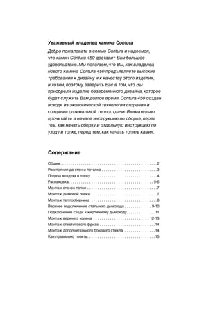 Инструкция по монтажу камина Contura 450/450T описывает этапы установки, включая размещение, монтаж дымохода и подключение к системе вентиляции. Документ подчеркивает важность соблюдения строительных норм и правил безопасности, а также необходимость предварительного получения разрешений от местных властей. Кроме того, содержатся технические характеристики и советы по уходу за камином.