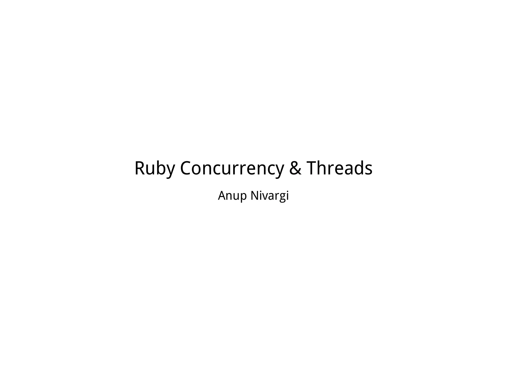 The document discusses concurrency and threads in Ruby, highlighting implementations in MRI, JRuby, and Rubinius. It includes examples of single-threaded and multi-threaded execution, along with performance benchmarks for CPU and IO intensive tasks. The content concludes with a discussion of threading caveats and links to further resources.