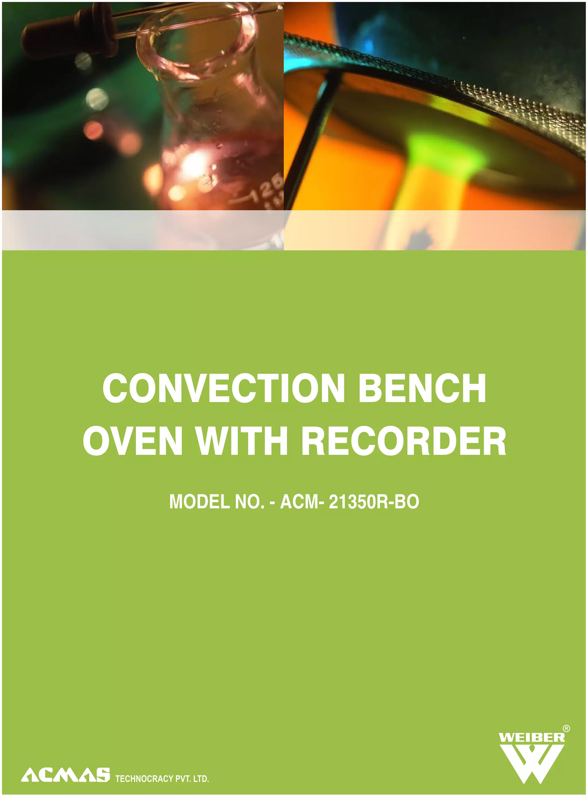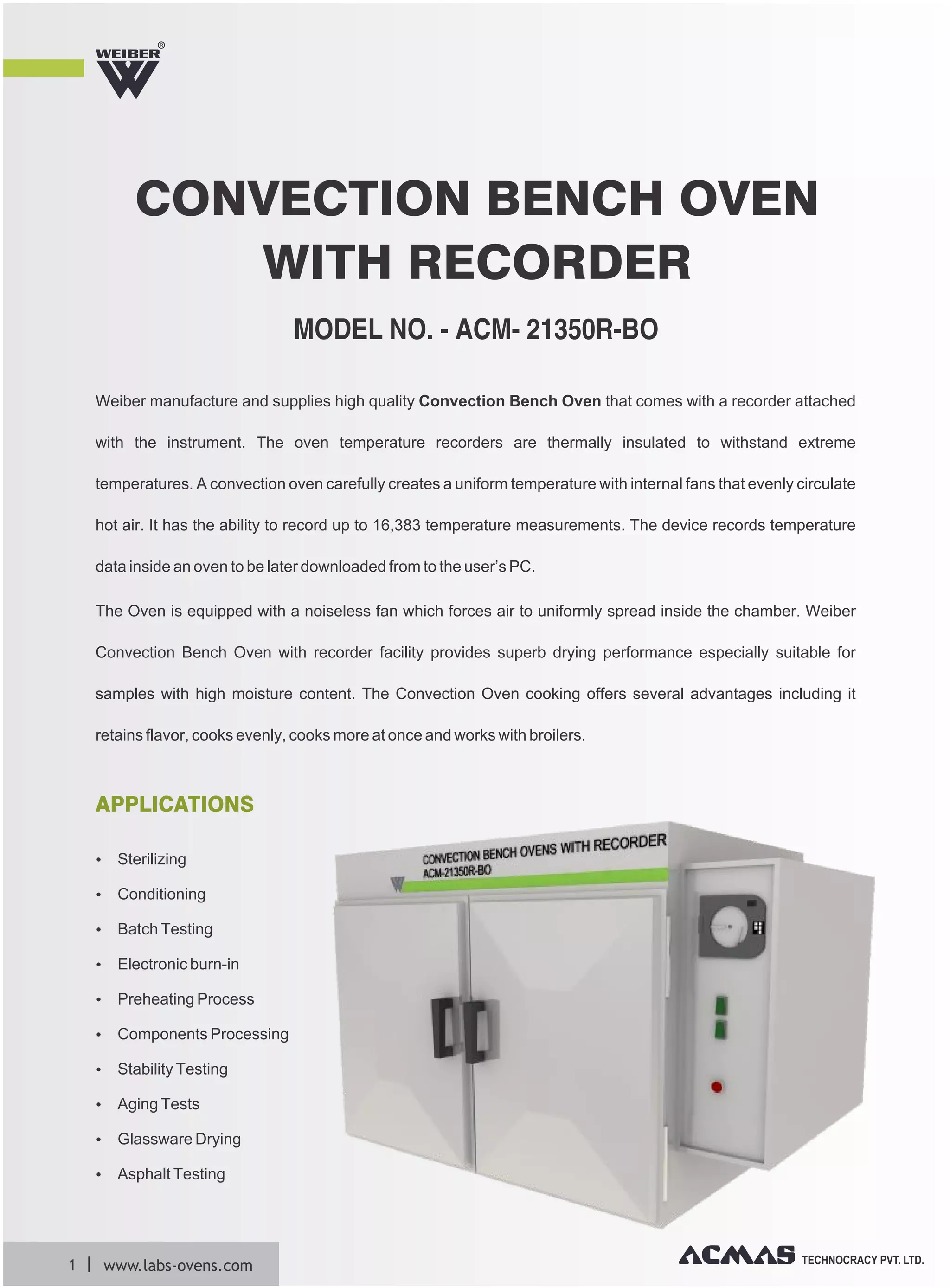 The document describes the Weiber Convection Bench Oven (model no. ACM-21350R-BO), which features a recorder for tracking temperature measurements and is designed for efficient heat circulation and drying of high moisture samples. It can record up to 16,383 temperature data points, offers energy efficiency, and includes advanced features such as a microprocessor-based PID controller and stainless steel construction. The oven is suitable for various applications including sterilization and stability testing, with dimensions of 45.7 x 50.3 x 35.6 cm and a maximum temperature of 450°F.