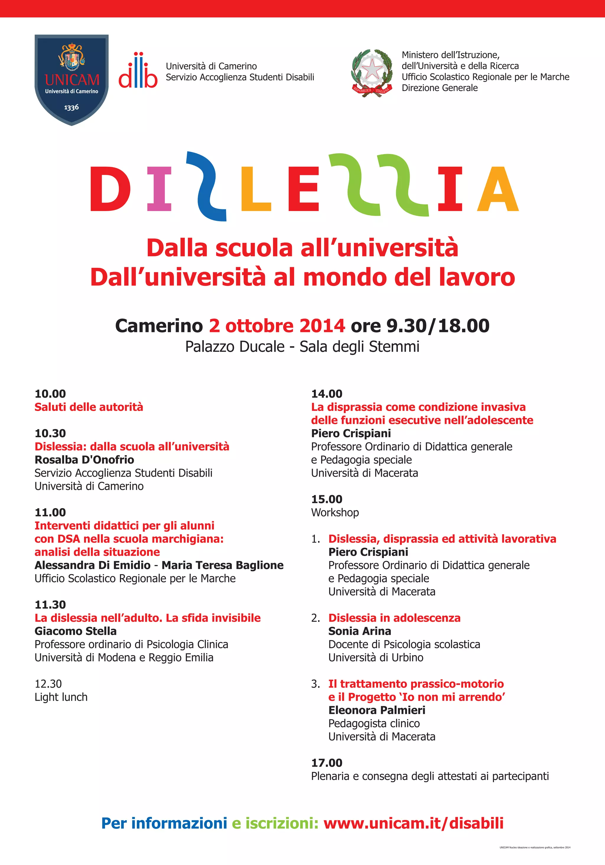 Il documento descrive un evento organizzato dall'Università di Camerino sul tema della dislessia, che si è svolto il 2 ottobre 2014. Il programma include interventi di esperti nel campo dell'educazione e della psicologia, workshop e una sessione plenaria. L'accento è posto sulla transizione dalla scuola all'università e al mondo del lavoro per studenti con disturbi specifici dell'apprendimento.