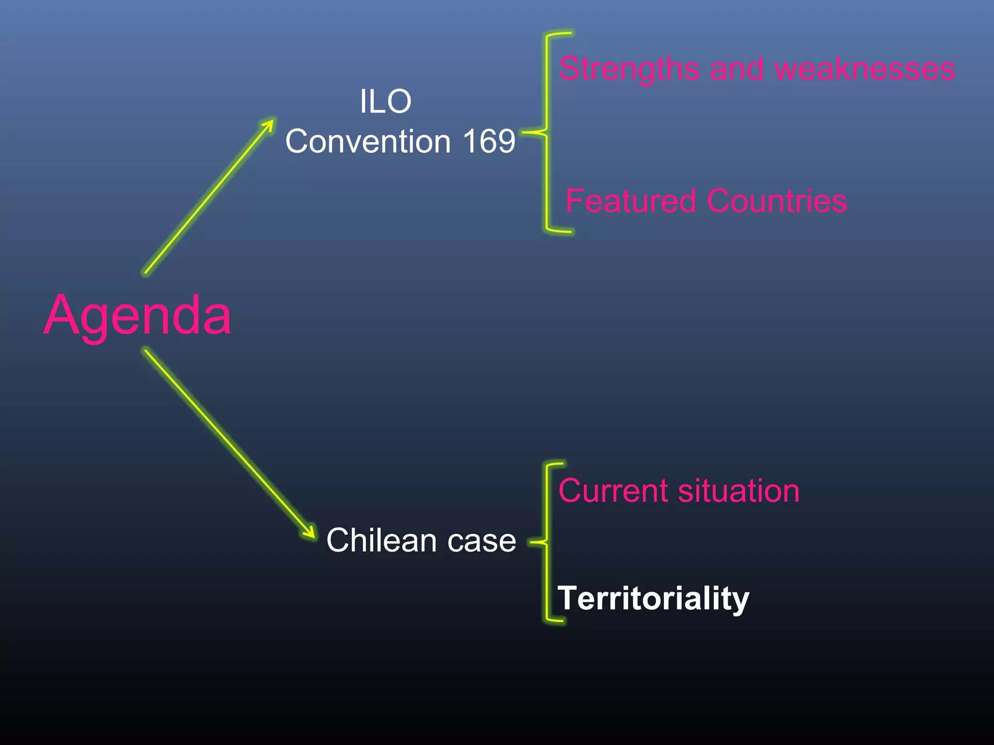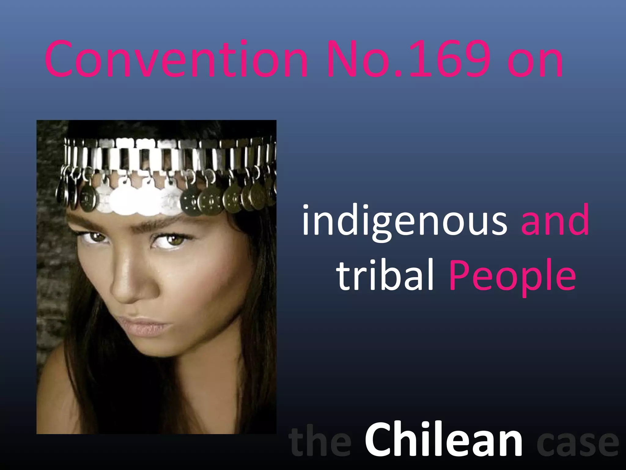 The document discusses ILO Convention 169 which protects the rights of indigenous and tribal peoples. It highlights Chile's ratification of the convention after 17 years and issues around its implementation, particularly regarding territorial rights of indigenous groups like the Mapuche people. The convention establishes rights to self-management within states and requires participation and consultation with indigenous groups on decisions affecting them.