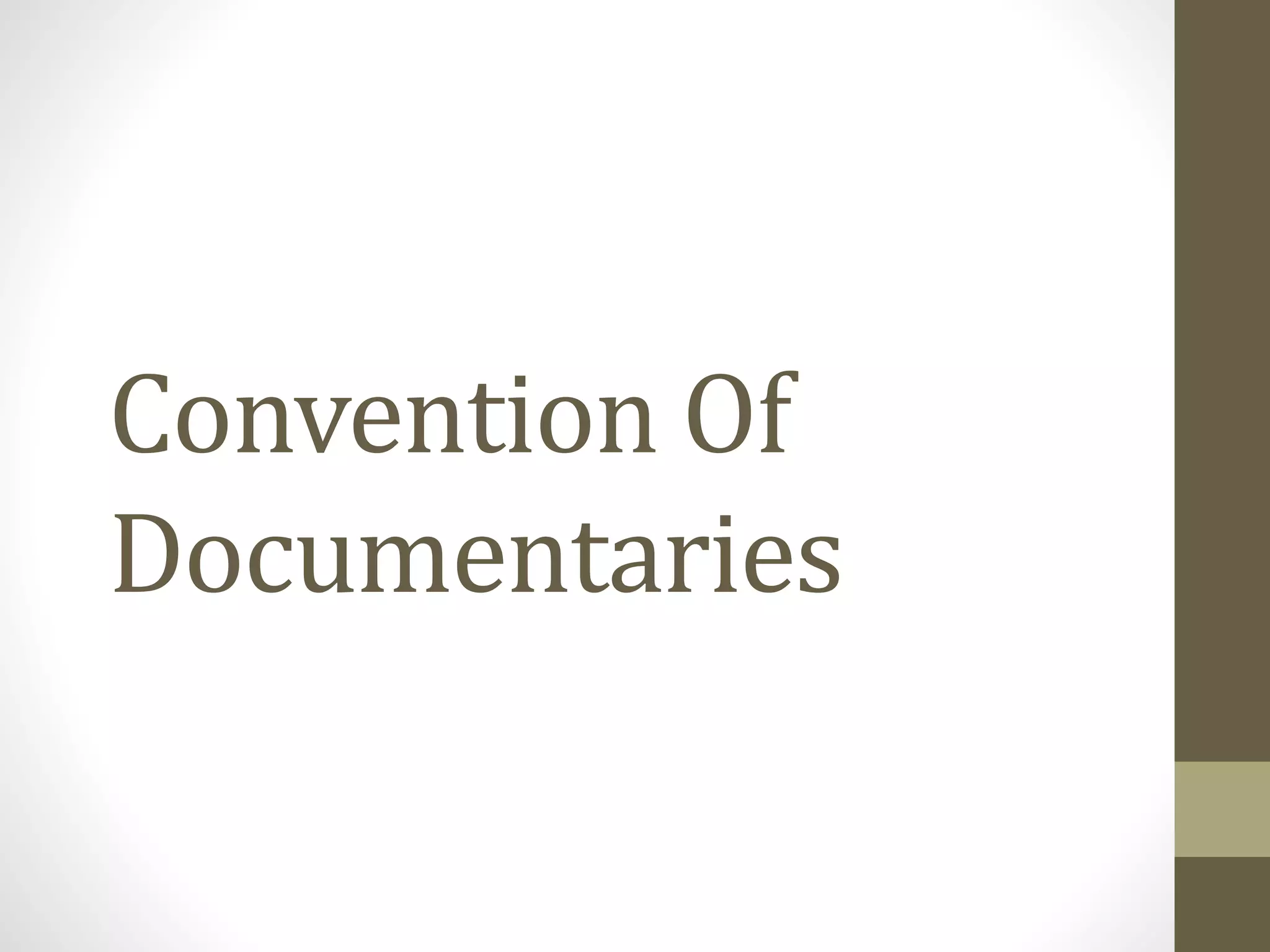 The document discusses various conventions of documentaries including genre, plot structure, realism, footage, interviews, costs, length, montage, sound, camerawork, and editing. It notes that documentaries often use a three-part structure of introduction, obstacles, and resolution. Realism, interviews with experts, and limited budgets are also emphasized. The proposed documentary will follow these conventions in exploring the challenges and rewards of the creative industries.