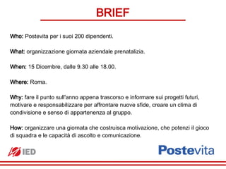 Il 15 dicembre 2010, Postevita organizza una giornata aziendale prenatizia a Roma per i suoi 200 dipendenti, mirata a riflettere sull'anno trascorso e motivare per le sfide future attraverso attività di team building ispirate al mondo del cioccolato. La giornata prevede una mattinata informativa con presentazioni e un pomeriggio dedicato a una gara culinaria tra team, con vari allestimenti e gadget a tema cioccolato. La location speciale, Officine Farneto, offre un ambiente unico e creativo per favorire la condivisione e il senso di appartenenza tra i partecipanti.