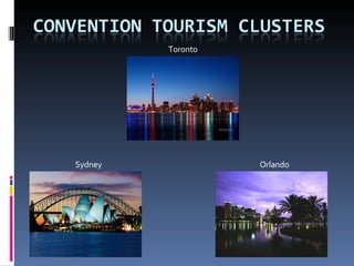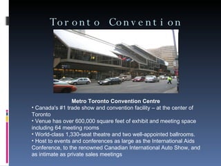 The document provides information about three convention centers - the Metro Toronto Convention Centre in Toronto, Canada, the Orange County Convention Center in Orlando, Florida, and the Sydney Convention & Exhibition Centre in Sydney, Australia. It includes details about their facilities, upcoming events, and partnerships.