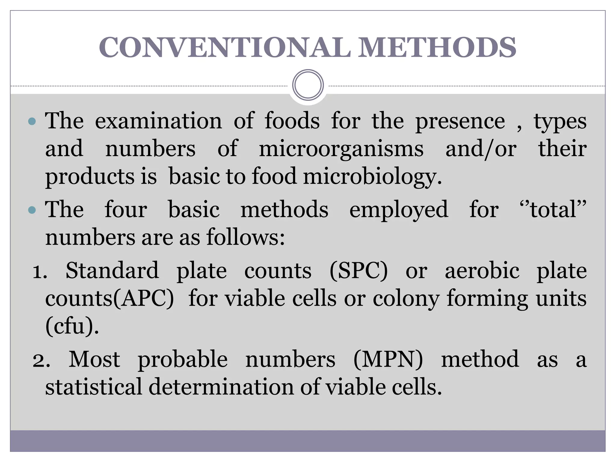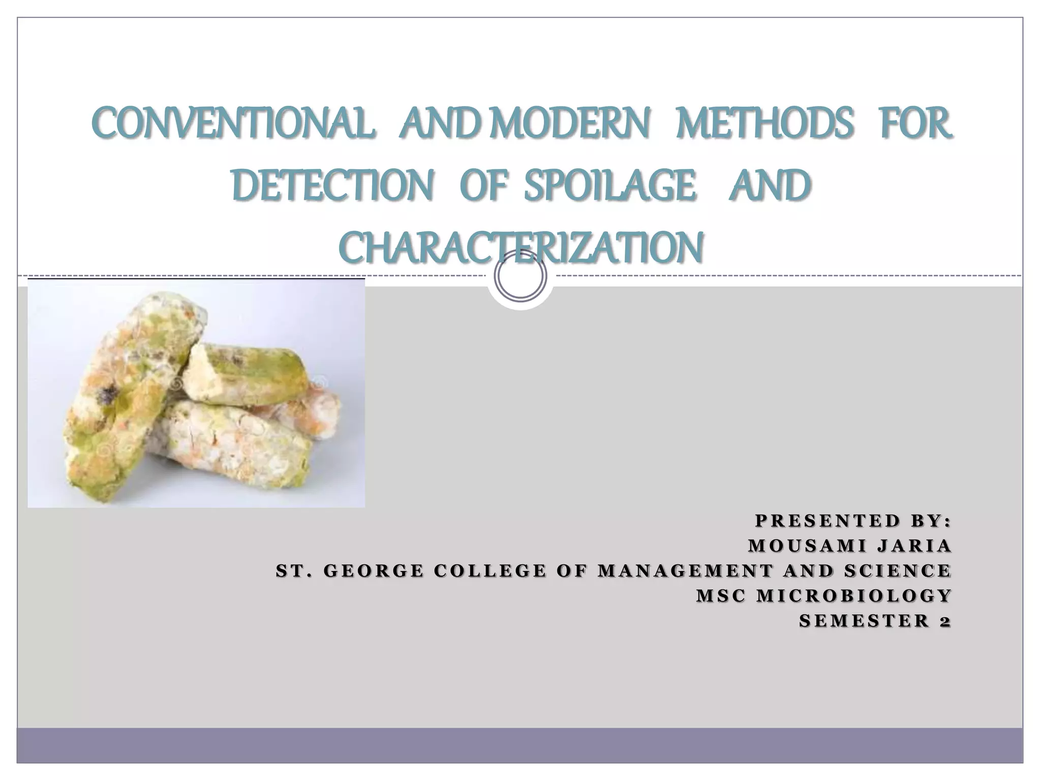 This document summarizes conventional and modern methods for the detection of spoilage and characterization of microorganisms in foods. It describes conventional methods such as standard plate counting, most probable number techniques, dye reduction, and direct microscopic counting. It then outlines several modern chemical methods like thermostable nuclease assays, Limulus amoebocyte lysate testing for endotoxins, and ATP bioluminescence. Biological methods like ELISA, PCR, and DNA probes are also covered. Finally, some physical detection methods involving biosensors, microcalorimetry, flow cytometry, and automated detection systems are presented.