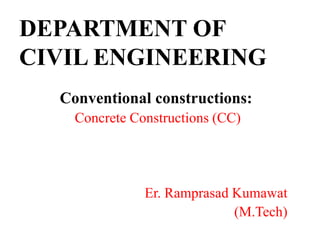 Concrete is a widely used construction material made by mixing cement, water, and aggregates. It has several advantages including being economical, able to harden at ambient temperatures, and provide excellent water resistance. There are various types of concrete including plain concrete, lightweight concrete, reinforced concrete, precast concrete, and prestressed concrete. Each type has different properties making it suitable for different applications in structures like buildings, bridges, roads, and more. Reinforced concrete adds steel reinforcement to provide high tensile strength, while precast concrete involves casting concrete elements off-site.