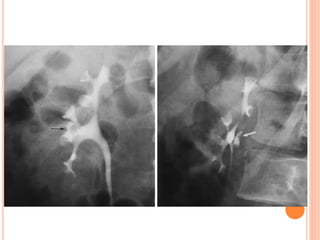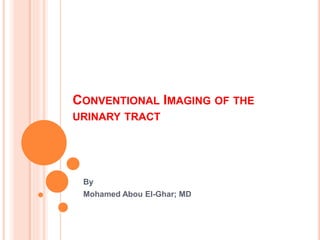 The document provides an overview of conventional imaging techniques of the urinary tract. It discusses conventional radiography, intravenous urography (IVU), voiding cystourethrography (VCUG), and contrast media. IVU involves injecting contrast dye intravenously to image the kidneys, ureters, and bladder. It allows evaluation of renal size and function. VCUG assesses the bladder, urethra, and detects vesicoureteral reflux by filling the bladder with contrast under fluoroscopy during voiding. The document outlines procedures, interpretations, and risks of these techniques, emphasizing their role in evaluating the urinary system.
