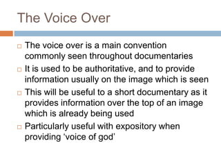 This document outlines several common conventions used in documentaries, including voiceovers to provide authoritative information to accompany images, using realistic lighting and ambient sounds during interviews to capture authentic footage, and conducting interviews with experts to authenticate views on the subject. Titles and props are also discussed as effective ways to quickly convey explanatory information within short documentaries.