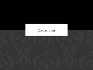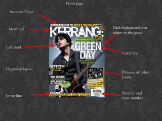 The document describes the typical conventions used in the front pages, contents pages, and double page spreads of magazines in a particular genre. Some conventions discussed include using sans serif fonts, dark backgrounds that relate to the genre, organized layouts with prominent cover lines and pictures, and pull quotes. Color schemes commonly seen in the genre, like reds, whites, and blacks, are also used to convey typical emotions. The overall layout follows conventions seen in other magazines of the same genre, such as a main central image surrounded by smaller images and text.
