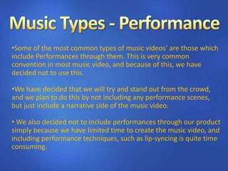 The document discusses the creative decisions made by FlowMotion Films regarding the conventions and techniques that will and will not be used in their upcoming music video. They plan to stand out by not including typical performance scenes and instead focusing on developing a narrative storyline. Their video will also emphasize thematic music and include visually stylish effects to attract viewers, while avoiding less common conventions like experimental camera techniques that may not appeal to their target teenage audience.