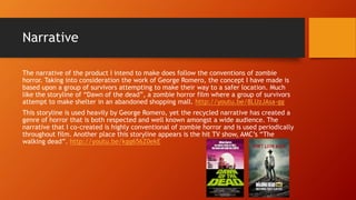 The document discusses the conventions that will be followed in a zombie horror film project. It will follow the classic narrative structure of a group of survivors trying to reach safety, as seen in films like Dawn of the Dead. Mise-en-scene elements like low-key lighting, modern costumes, and dirty/bloody makeup for survivors and zombies will be used. Camerawork will employ common horror techniques like close-ups, establishing shots, and handheld shots. Sound will include tense non-diegetic music and rushed dialogue from survivors with zombie moans. Editing will use continuity to maintain audience interest within the constraints of a trailer format.