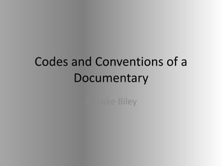 The document discusses the codes and conventions used in creating a documentary about skateboarding. It describes using a voiceover to explain what is happening and introduce the skaters. Real footage of the skaters was included to avoid appearing fake, along with natural lighting and background sounds during interviews. Five skaters were interviewed about how they got into the sport, who inspired them, and their future plans. Text titles were added to identify skaters and set the scene. Visual elements like skaters' clothing and footage of the skate park provided relevant context.