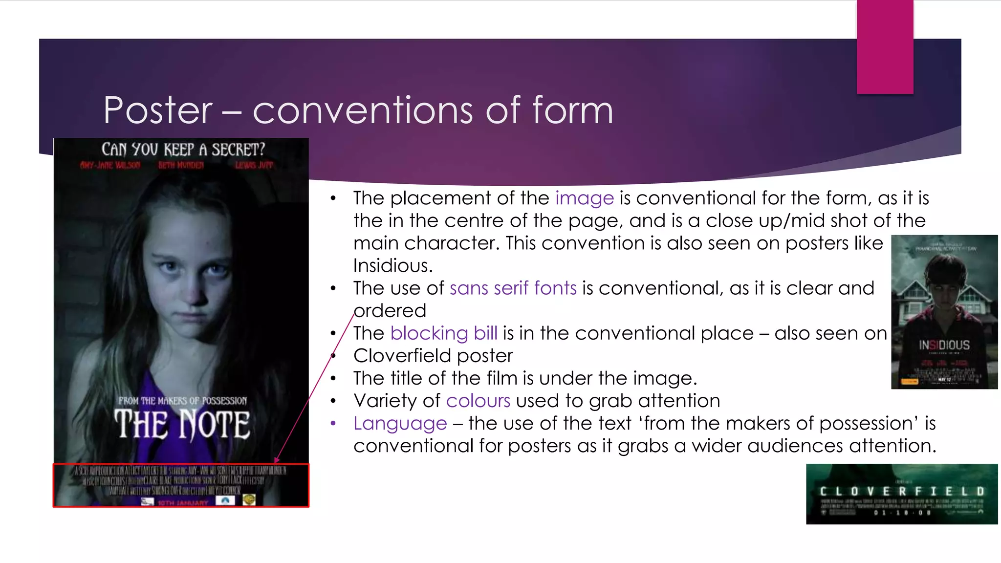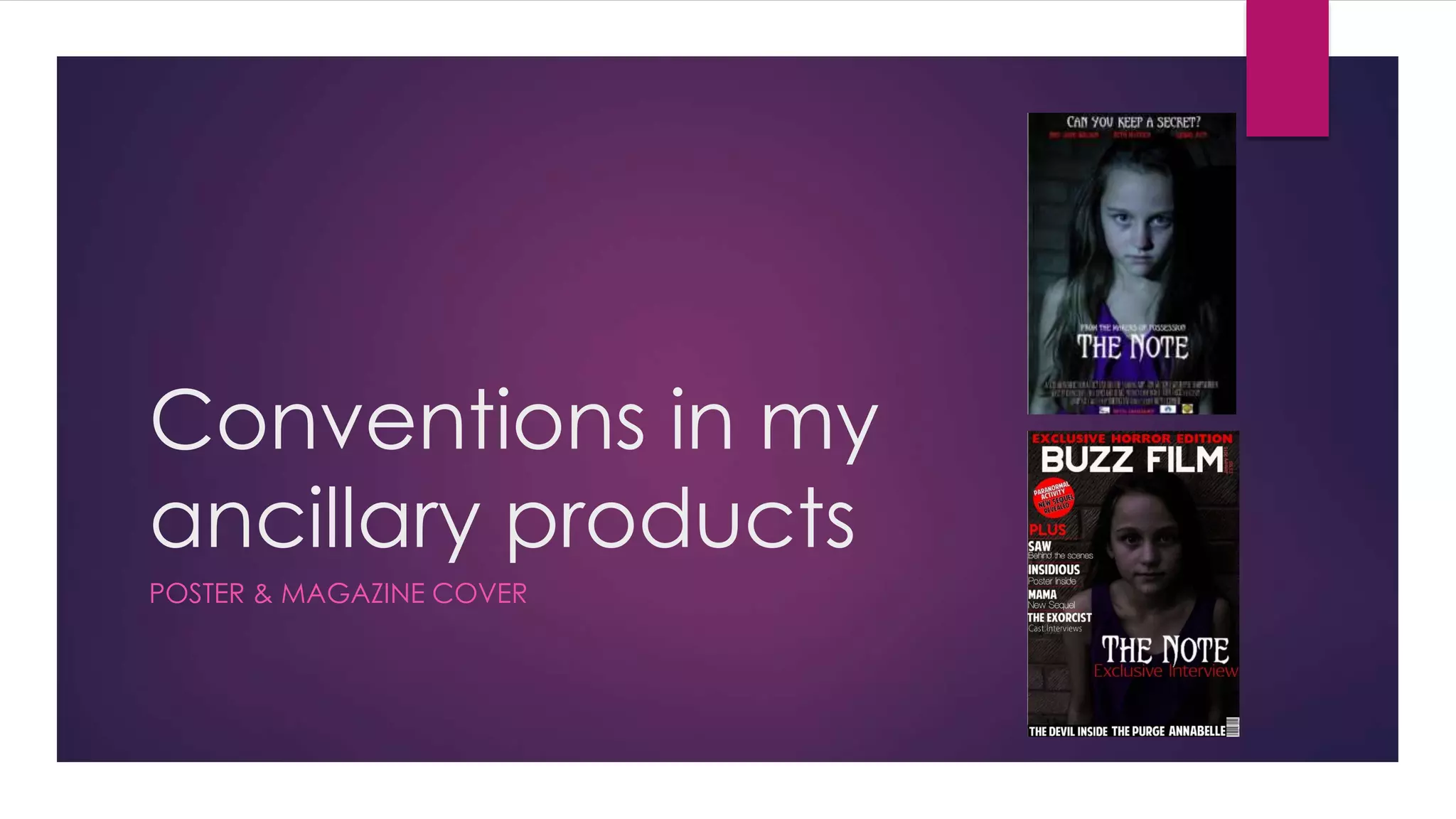 This document discusses conventions used in movie posters and magazine covers for horror films.