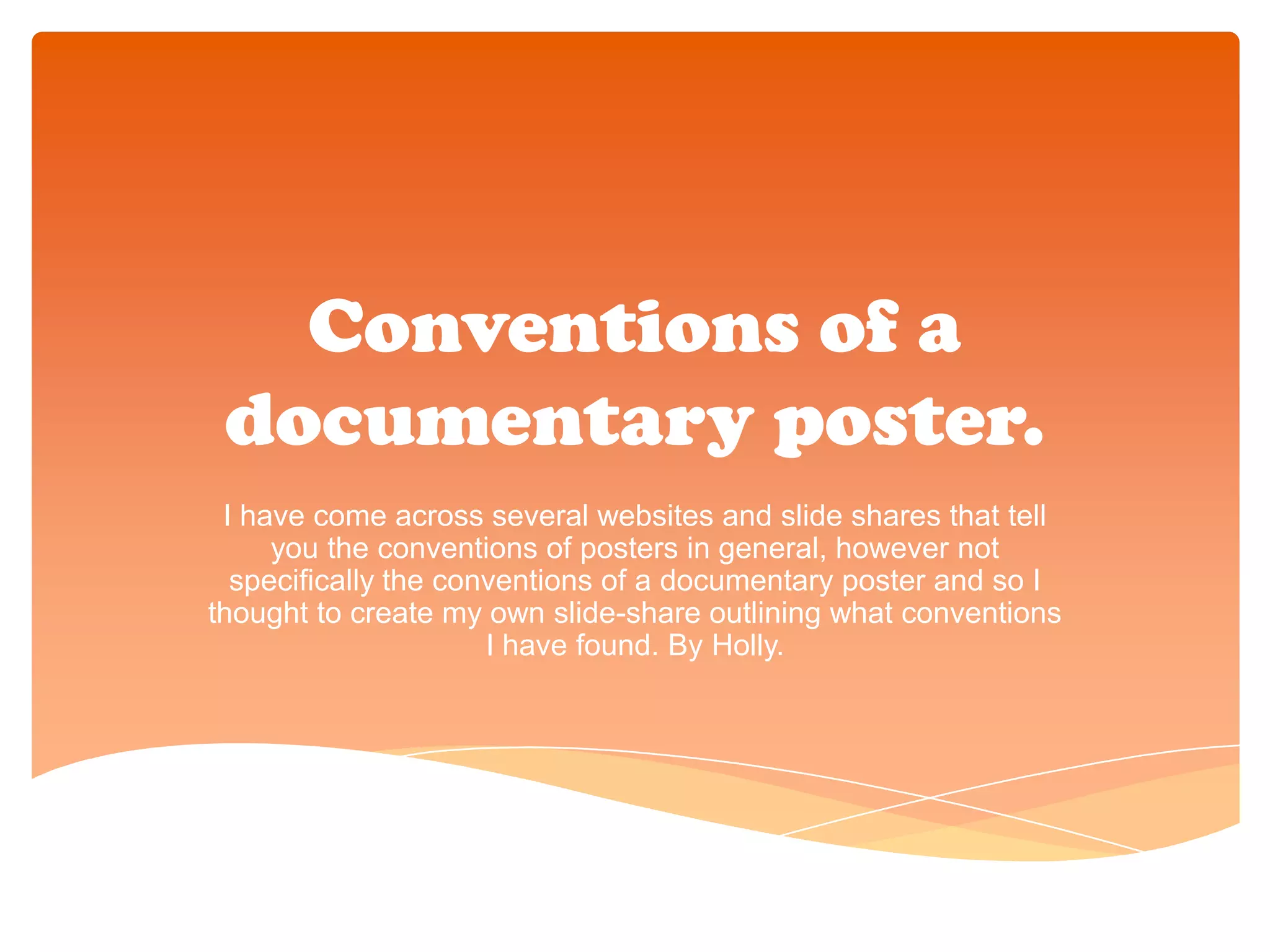 The document outlines conventions for documentary posters, including indicating the genre through images or text, including quotes from reviews or the documentary itself, prominently featuring the director's name to draw on their reputation, displaying any awards the documentary has won from prestigious organizations, and using captions that entice viewers without revealing too much about the documentary.