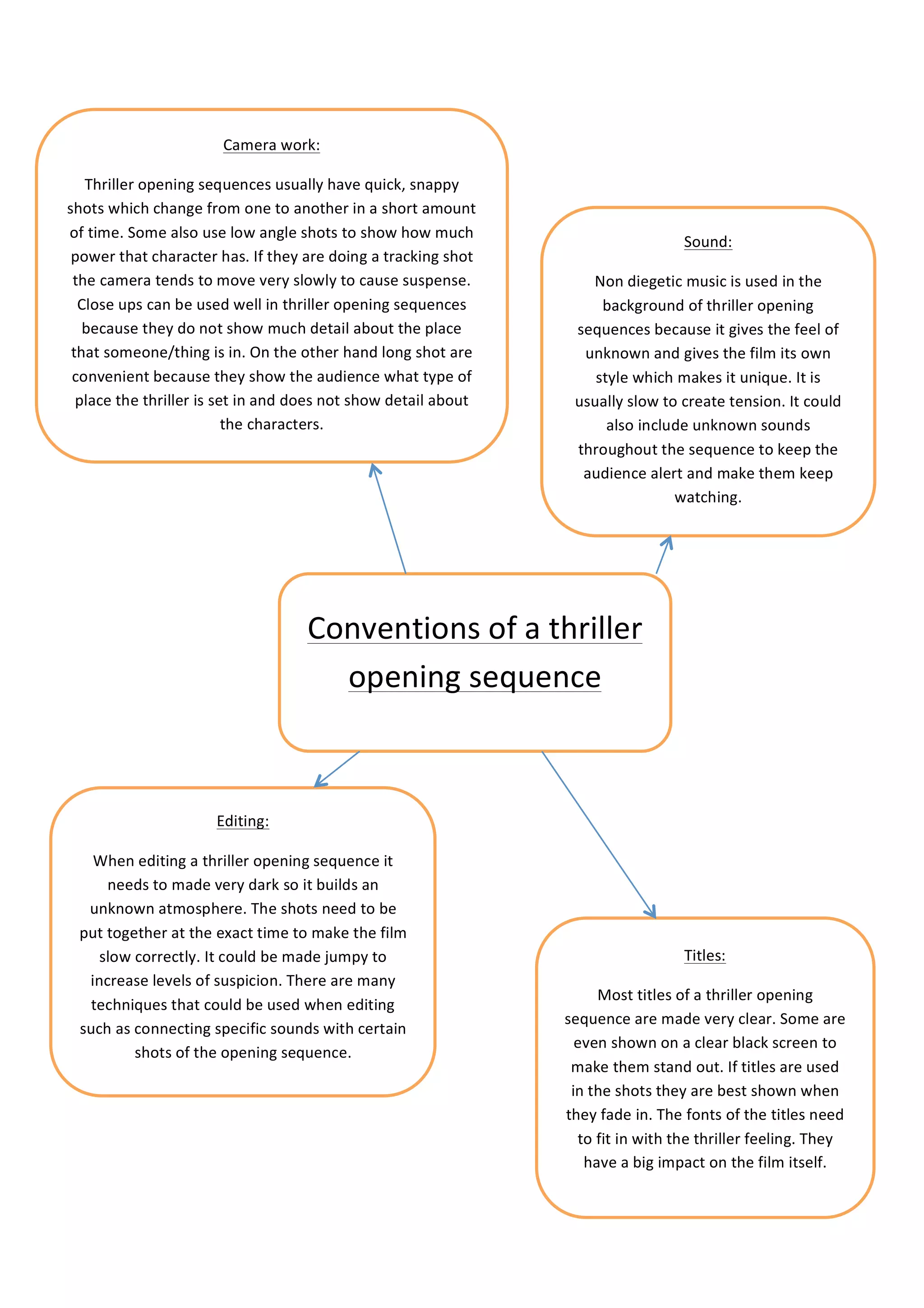Thriller opening sequences typically use quick cuts between shots, low camera angles, and slow tracking shots to build suspense. Non-diegetic music and unknown sounds in the background create tension and mystery. Editing is dark and jumpy to develop an unknown atmosphere and connect specific shots and sounds. Titles are clearly displayed against a black screen or faded into shots using fonts that suit the thriller genre.