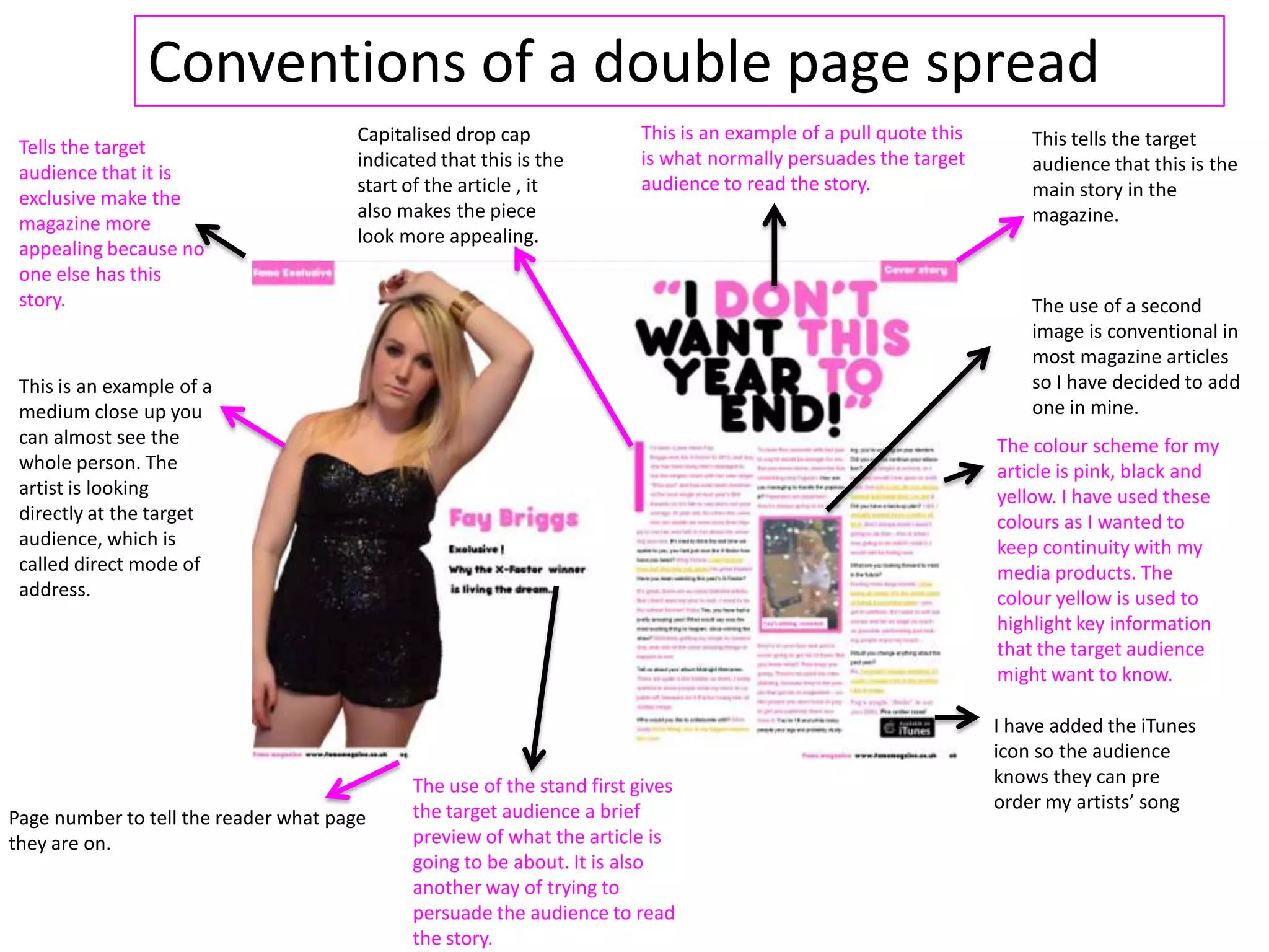 This document discusses conventions used in magazine double page spreads. It provides examples of conventions like using a stand first or pull quote to entice readers. The document also discusses using consistent colors and layouts across pages to create continuity. It highlights how the creator of this spread followed conventions by including two images, using a similar layout to another magazine, and including questions about the celebrity's personal life to appeal to readers.