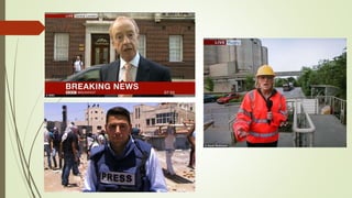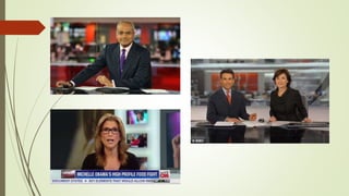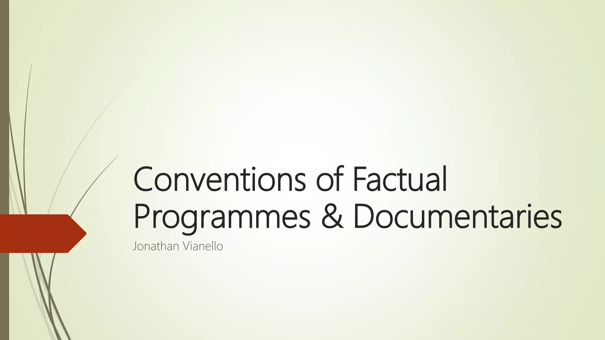 This document outlines several conventions of factual television programs and documentaries. It discusses the roles of anchor/newsreaders and field reporters in factual programs, as well as conventions like linking to other studios, addressing the viewer, and using interviews and footage. For documentaries specifically, it notes the use of handheld cameras, narrative voiceovers, vox pops, archive materials, and creative editing. Overall, the document provides an overview of common techniques used in factual television programming to inform audiences and tell true stories.
