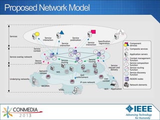 The document outlines the framework for an IP-based next-generation service overlay network (NGSON), focusing on context-aware, adaptive, and self-organizing networking capabilities. It discusses various aspects such as service composition, application support layers, and dynamic policy enforcement for enhanced service interaction and delivery. The role of standards in improving QoS and integrating services, applications, and networks within a converged digital ecosystem is highlighted, along with the importance of context awareness in enhancing service functionality.