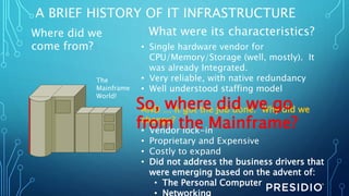 Converged infrastructure groups multiple IT components like servers, storage, and networking equipment into a single optimized package. It provided a single support model but fell short in management, automation, orchestration, and flexibility. Hyper-converged infrastructure tightly integrated storage similar to how virtualization integrated servers, allowing simpler and denser infrastructure. However, both converged and hyper-converged infrastructure only made infrastructure marginally easier and did not support the goal of treating computing resources like utilities. True cloud-native applications that are serverless, containerized, and code-focused will require software-defined infrastructure to fully realize the fourth computing paradigm.