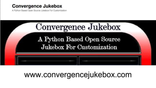 The document describes the Convergence Jukebox, an open-source digital jukebox system written in Python. It can run on Windows and Raspberry Pi, plays MP3 files from an unlimited sized library, supports automatic detection of new songs, and has features like background music, genre filtering, song skipping, and displaying song details. Users can navigate music by title or artist and select songs to play, which are added to an upcoming playlist and removed from random rotation. The jukebox also generates logs and has undocumented integrations with digital displays and social media.
