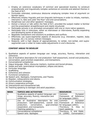 This document provides information on an English conversation course offered at Universidad Tecnologica de Pereira. The course aims to develop students' conversational competence and metacognitive skills in English. It will focus on spoken interaction, social situations requiring conversation skills, and teaching speaking methodologies. Students will practice conversations through activities and presentations. Evaluation will consist of formative, summative, and self-assessment, including exams, in-class work, and reflection on learning. The course aims to prepare autonomous, respectful, and active English language teachers.