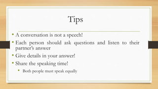 Conversation tips include taking turns speaking equally, asking open-ended questions that can't be answered with just yes or no, and following up with additional questions to keep the conversation flowing. The document provides examples of question types like who, what, when, where, why, how as well as follow up questions to ask after someone answers an initial question. Thoughtful questions are also suggested to encourage deeper thinking on a topic.