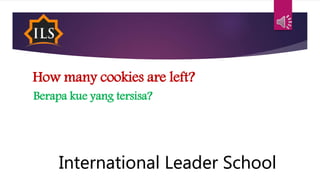 The document discusses numbers and counting in both English and Indonesian. It contains exchanges where various quantities are asked about and answered, including the number of cookies left, people in a group, fingers on a hand, students in a class, and work hours in a day. The questions and answers help demonstrate counting and quantifying items or people in both languages.