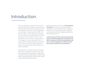 The document discusses the benefits of conversational presenting over traditional linear presentations. Conversational presenting involves asking audience members questions to guide the discussion and keep them engaged. It shifts the presentation from a one-way lecture format to an interactive dialogue. This approach saves time by focusing only on relevant content, ensures each presentation is tailored to the audience's interests, and improves understanding by providing necessary context. Conversational presenting is well-suited for modern business needs as audiences now expect two-way discussions and prefer visual storytelling techniques that aid memorability.