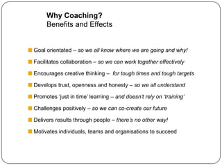 The document outlines a coaching approach to leadership, emphasizing the importance of creating a supportive environment for individual growth and collaboration. It highlights key benefits of coaching, such as fostering trust, encouraging creativity, and promoting continuous feedback and development. Various strategies, such as effective questioning and flexible behavior, are suggested to empower teams and sustain organizational success.