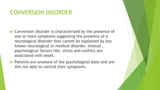 Conversion disorder is characterized by neurological symptoms that cannot be explained by medical causes. Instead, psychological stressors are associated with the onset of symptoms. Patients are unaware of the psychological basis and cannot consciously control their symptoms. Common symptoms include paralysis, abnormal movements, seizures, and sensory disturbances. Diagnosis involves ruling out physical disorders and assessing for dissociation. Treatment options include psychotherapy, hypnosis, and supportive therapy.
