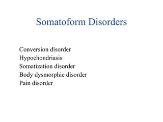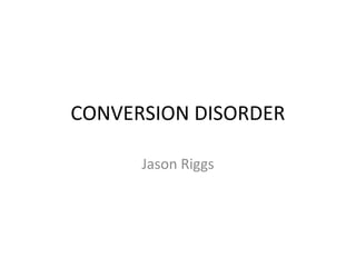 Conversion disorder is characterized by neurological symptoms like paralysis, blindness, or seizures that are not explained by medical factors. It develops due to psychological stress converting into physical symptoms. While the symptoms are real, they are considered psychologically rather than neurologically caused. Conversion disorder is most common in late childhood to early adulthood, and women are diagnosed more often than men. Treatment involves psychotherapy with a caring therapist to address underlying stressors, as symptoms often resolve spontaneously within days to a month with support. Occupational therapy can help by focusing on coping skills, home modifications, and family education.