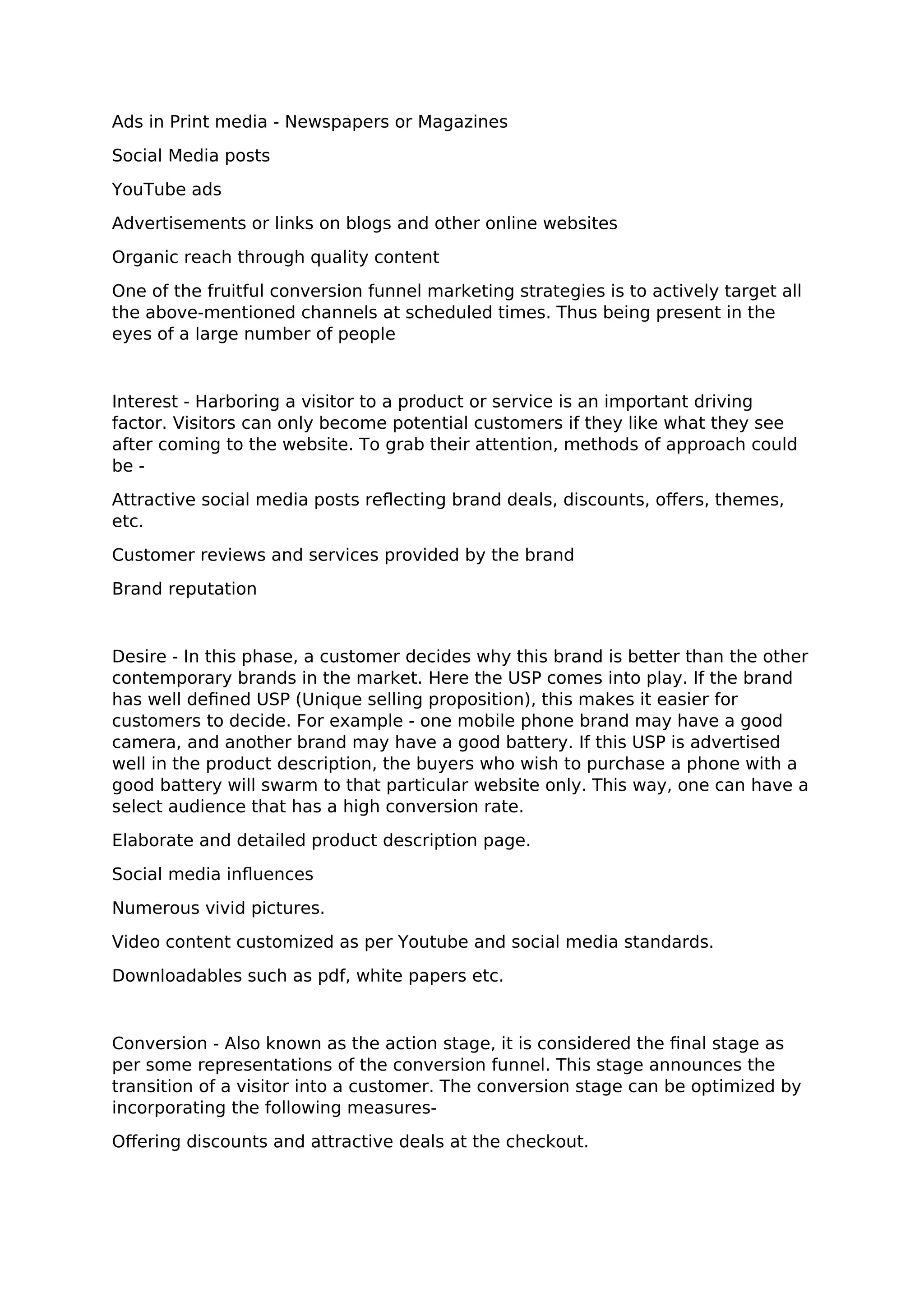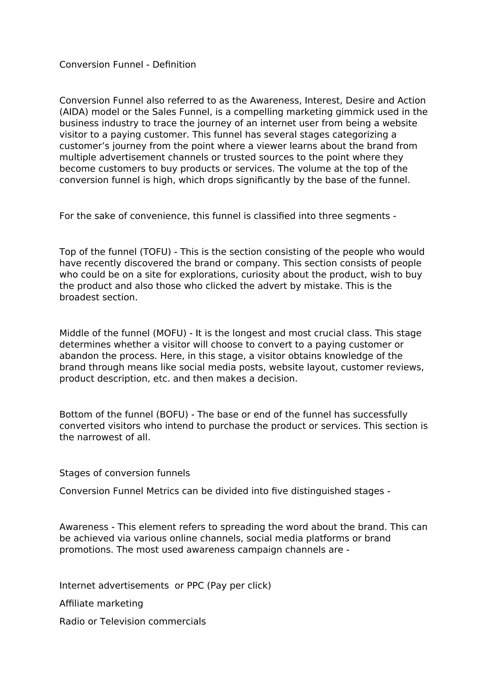 The conversion funnel, or AIDA model, illustrates the progression of potential customers from being aware of a brand to making a purchase. It entails several stages: top (awareness), middle (interest and desire), and bottom (conversion), each with unique strategies for engaging visitors. Additionally, the final phase focuses on customer retention and loyalty, emphasizing the importance of addressing customer feedback to maintain brand reputation.