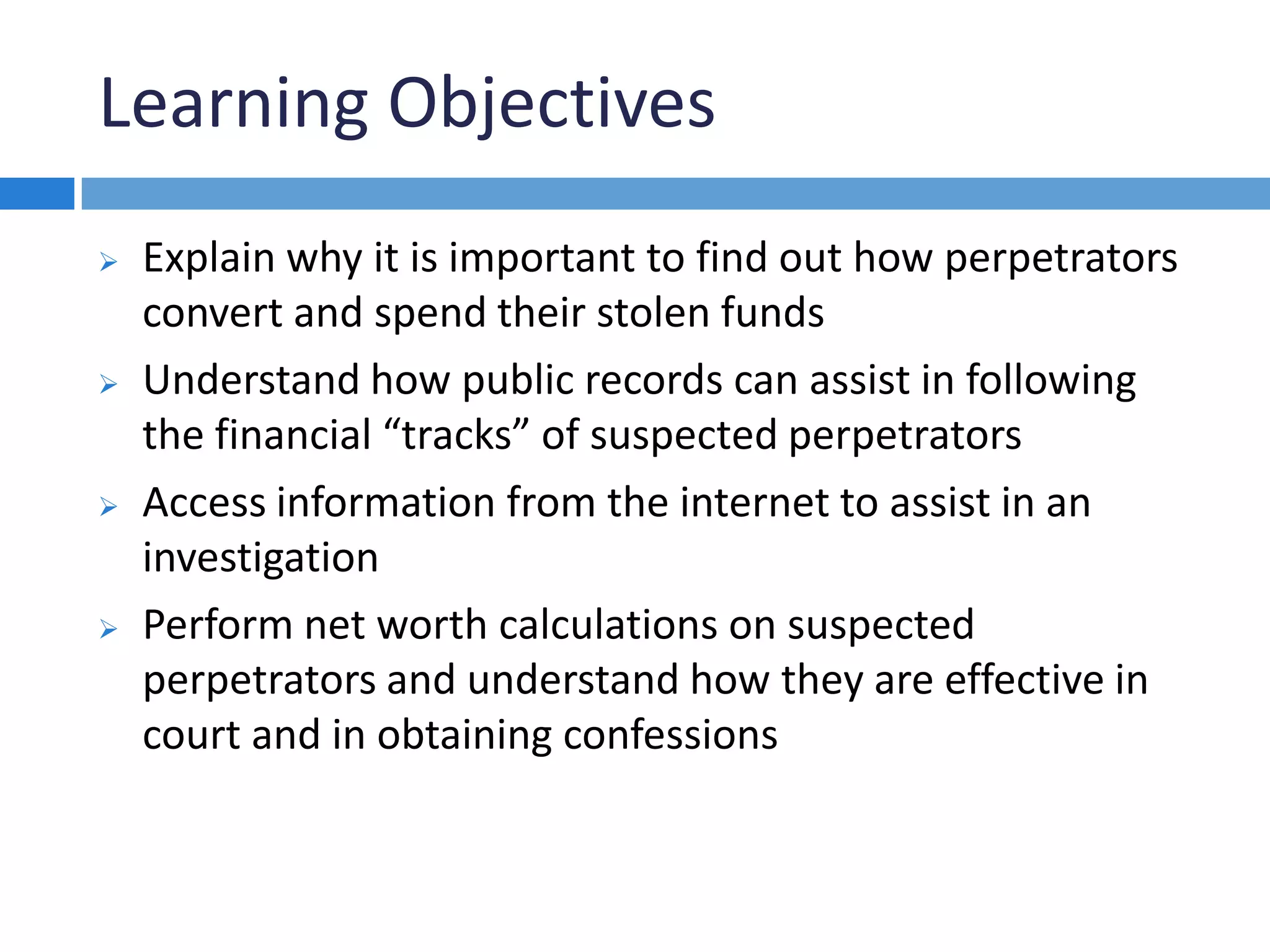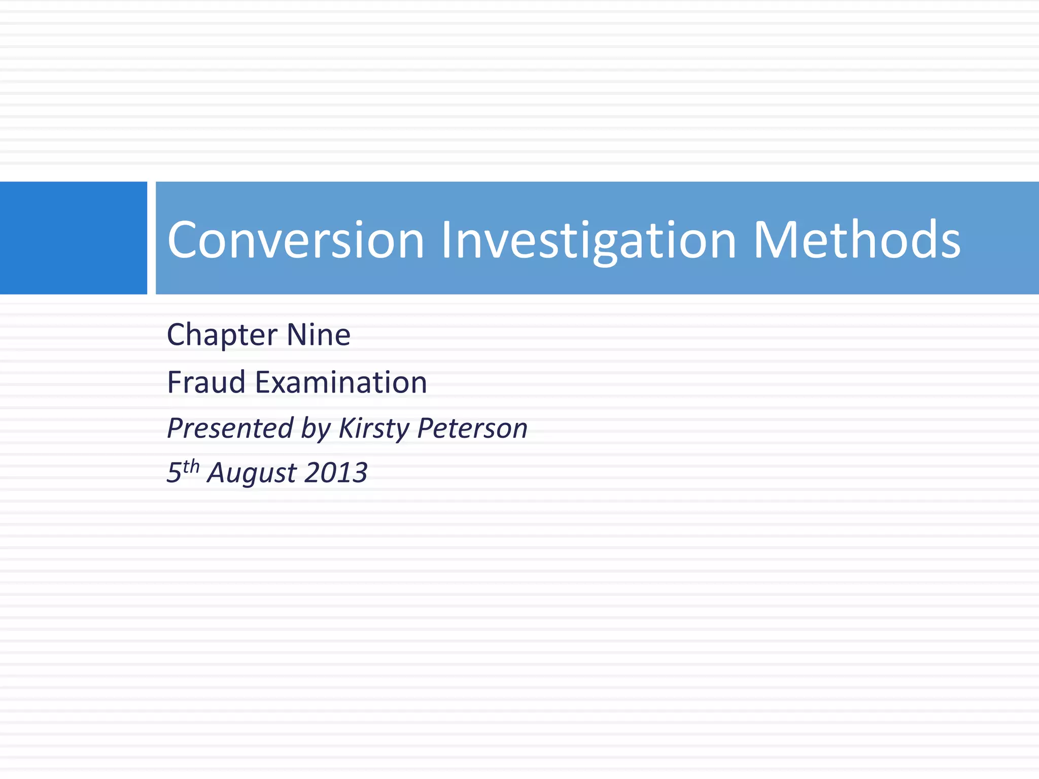 This document discusses methods for investigating how perpetrators convert and spend stolen funds during a fraud examination. It explains that conversion searches are important to determine the extent of embezzlement and gather evidence that can be used to obtain confessions. Public records, private sources, online databases, and internet searches can be used to find information about suspects' lifestyles and expenditures. Net worth calculations compare suspects' assets and income over time and can reveal funds from unknown sources.
