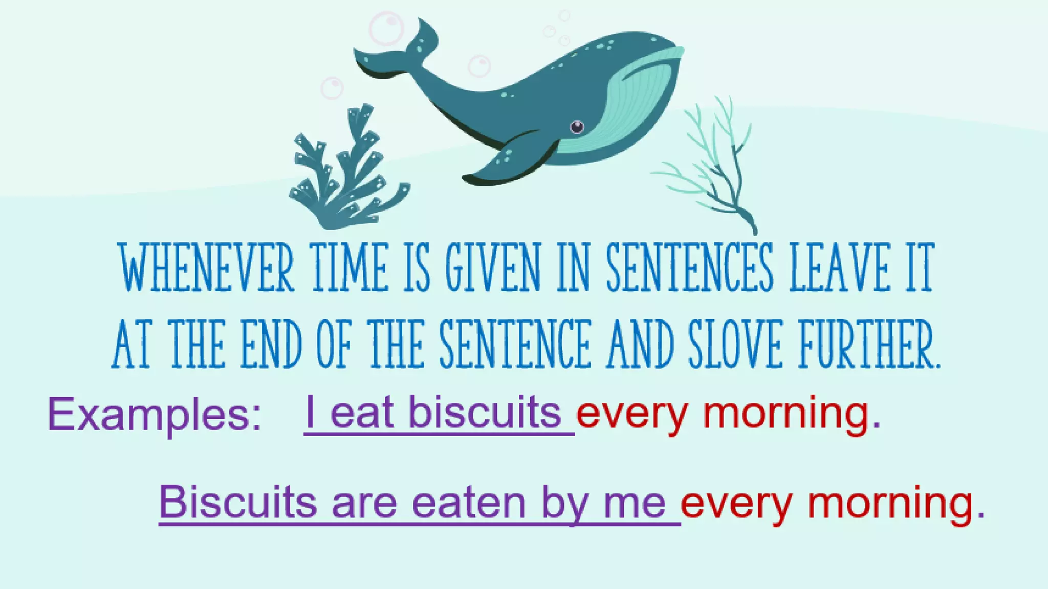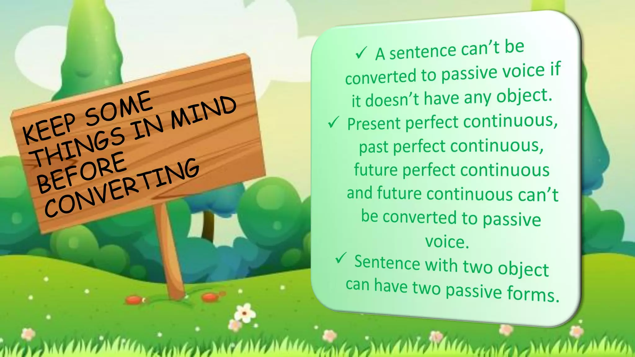 The document outlines the process of converting sentences from active to passive voice, detailing steps such as identifying the subject, verb, and object, and providing numerous examples for clarity. It emphasizes the proper use of verb forms and auxiliary verbs in various tenses, along with rules for dealing with pronouns and ditransitive verbs. Additionally, it provides guidance for converting imperative and negative sentences into passive voice.
