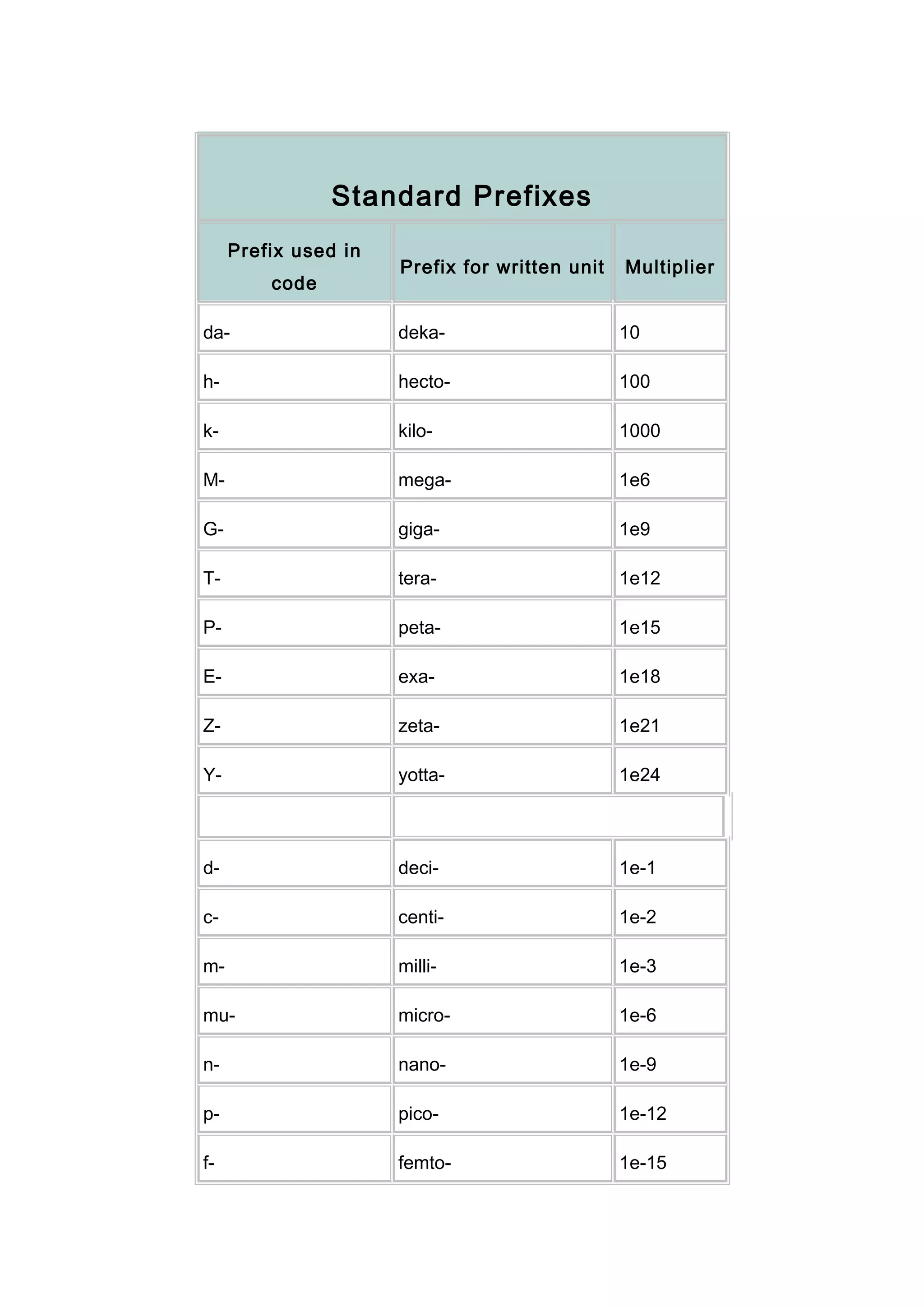 The document provides a comprehensive list of standard prefixes and units of measurement, detailing their symbols and definitions across various categories such as time, length, mass, force, energy, pressure, and volume. It includes both metric and imperial units, as well as alternative symbols for certain measurements. The information is organized systematically for reference in scientific and engineering contexts.