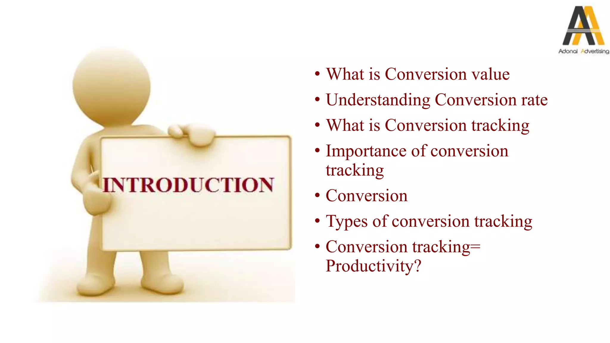 The document explains conversion value, conversion rates, and the importance of conversion tracking in marketing, detailing how conversions measure valuable user actions like sales or inquiries. It outlines various types of conversion tracking methods and offers tips for improving conversion rates, such as optimizing keywords and creating dedicated landing pages. Additionally, the document discusses how conversion tracking enhances ad spending efficiency and provides insights for smarter marketing decisions.