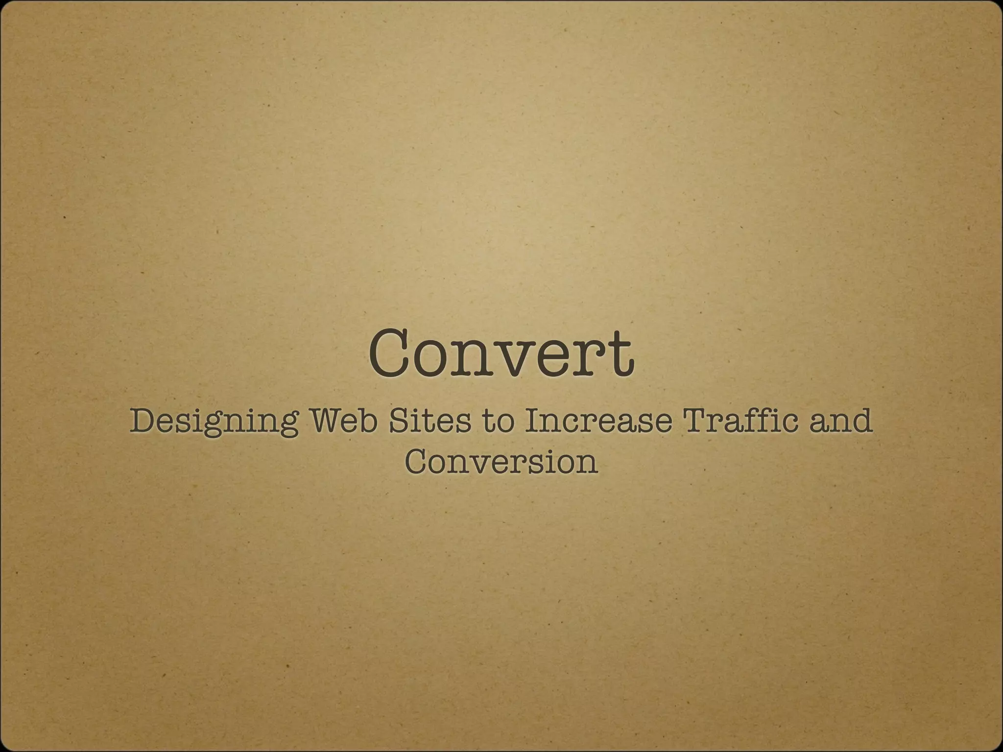 Designing websites to optimize for both traffic and conversion is important for success. Websites should be designed to clearly communicate their topic to search engines to attract the right kinds of visitors, rather than taking a generic approach. Design is about solving problems, not just aesthetics. Success requires getting the right number and type of people to visit along with converting as many visitors as possible into actions like purchases. Investing effort into both traffic and conversion delivers the best results, as having one without the other leads to no success.