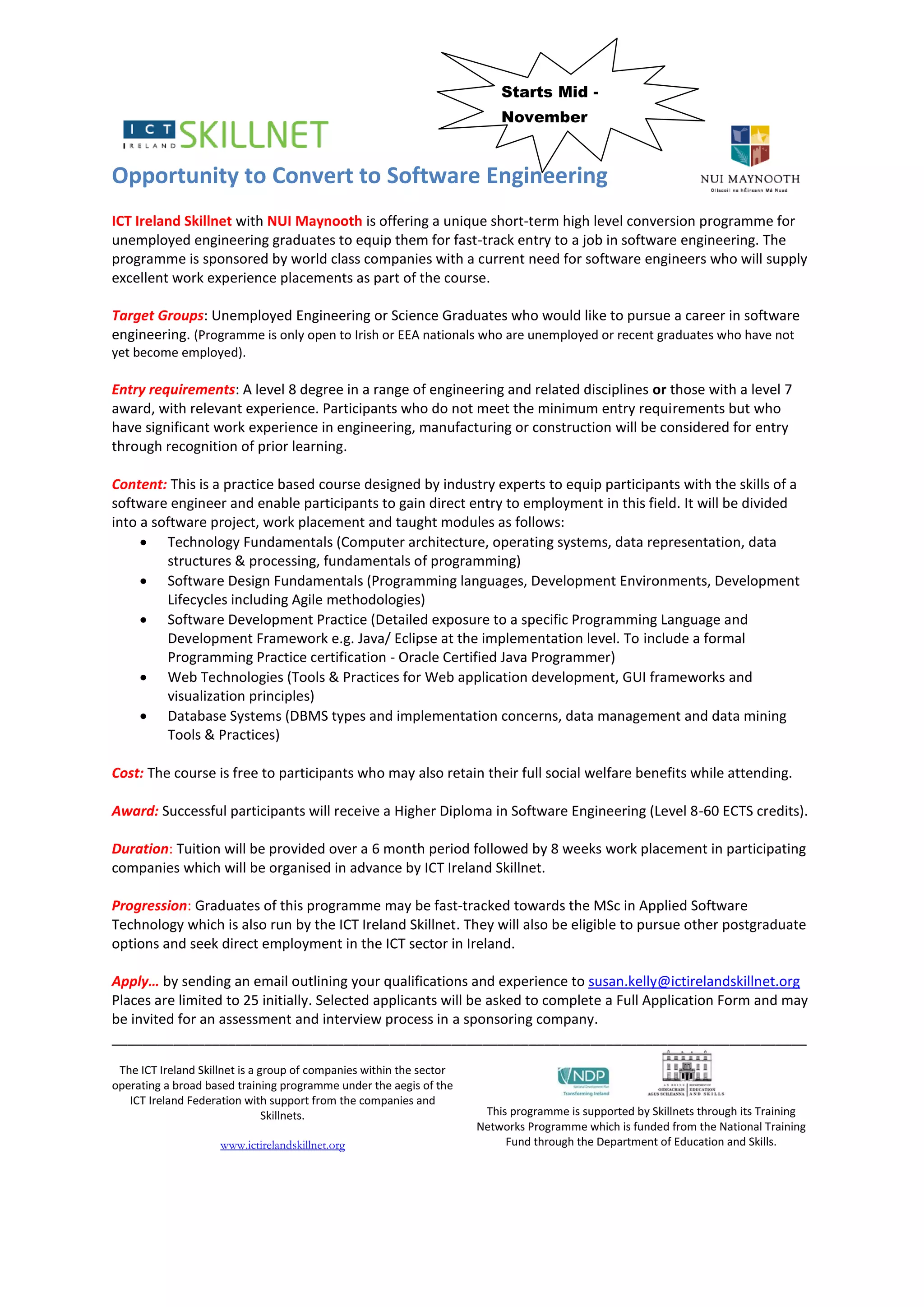 The ICT Ireland Skillnet is offering a free 6-month program to train unemployed engineering graduates in software engineering skills. The program includes taught modules in areas like programming, databases, and web technologies. It also includes an 8-week paid work placement at a sponsoring company. Successful graduates will receive a Higher Diploma in Software Engineering and may be fast-tracked for further education or jobs in the IT sector in Ireland. The program is limited to 25 participants and starts in mid-November 2011.