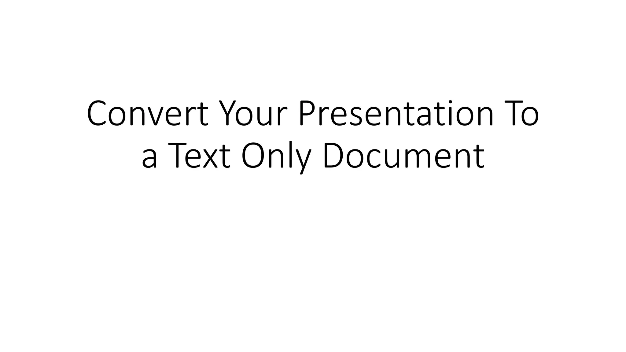 To convert a PowerPoint presentation to a text-only document, click File then Export and Create Handouts. Select the Outline Only page layout option to see the entire presentation translated into an outline format in Microsoft Word. This allows including images and links from the slides in the new document.