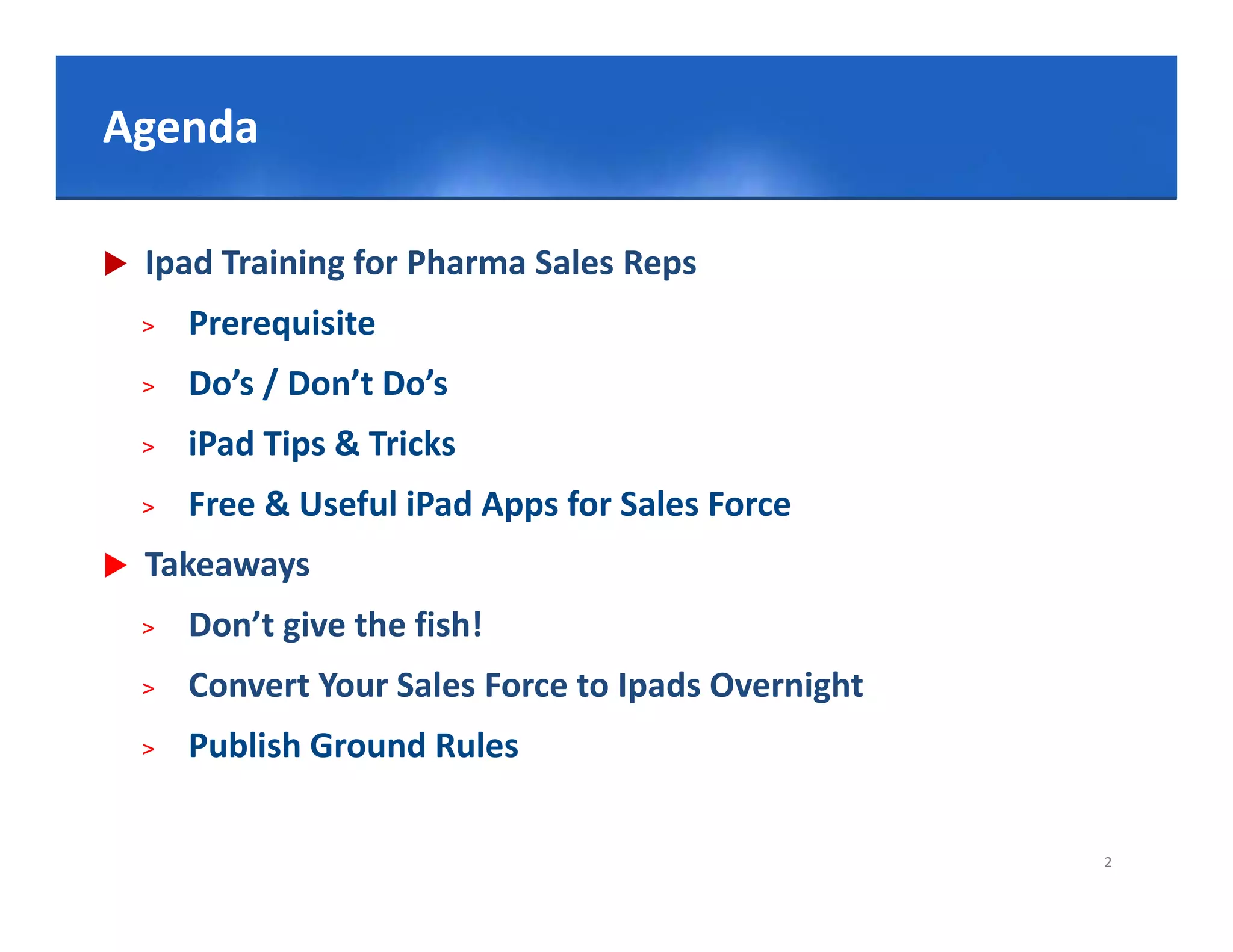 The document outlines guidelines for training pharma sales representatives on effective iPad usage, including prerequisites, do's and don'ts, and tips for optimizing their experience. Key points emphasize the importance of security training, appropriate behavior while using iPads, and the necessity of following company rules regarding electronic document sharing. Ultimately, it advocates for the swift transition to iPads for sales personnel to enhance their digital proficiency.