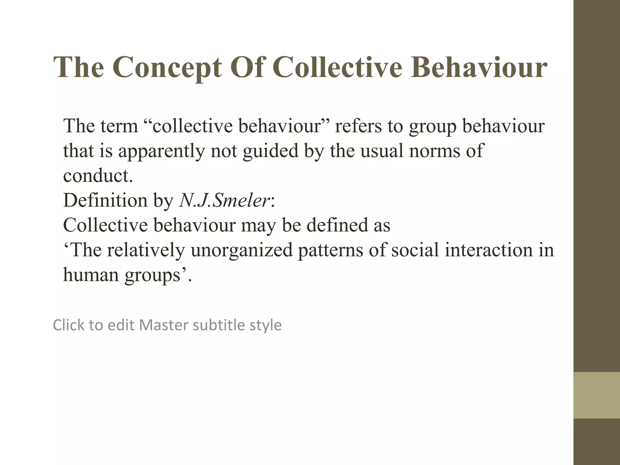 Collective behaviour refers to group behaviour that is not guided by usual social norms. It is relatively unorganized and unpredictable. Some key characteristics of collective behaviour include being temporary, unplanned, lacking rules or procedures, and prone to rumours and misinformation. Examples include panic behaviour during emergencies. Theories of collective behaviour aim to explain how it arises from conditions like structural strains, the spread of general beliefs, and precipitating events. Crowd behaviour is a type of collective behaviour where people in close proximity develop a shared focus and their individual identities feel anonymous within the group.