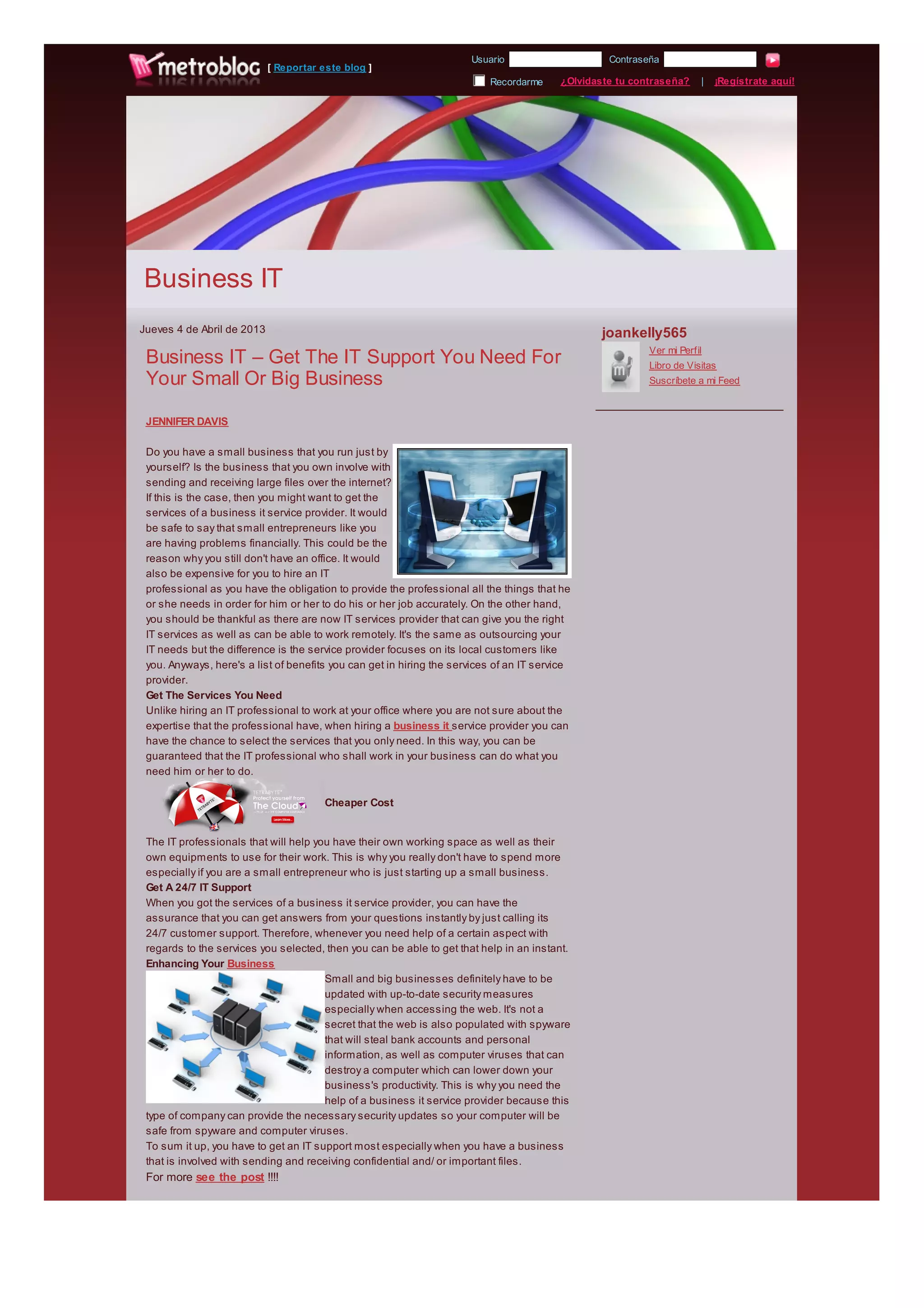 The document discusses the benefits of hiring an IT service provider for a small business. It notes that an IT service provider can provide the necessary IT services at a lower cost than hiring an in-house IT professional. It also allows a business to get 24/7 support and only pay for the specific services needed rather than the full expertise of an in-house professional. Outsourcing IT services to a provider enhances security and allows a business to focus on its core operations.