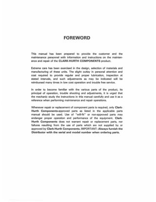 The document provides instructions for maintaining and repairing a Clark-Hurth torque converter. It begins with an overview of how torque converters and transmissions function together in the powertrain to deliver engine power to the wheels. It then provides detailed sectional views and parts identification diagrams to familiarize mechanics with the internal components. The remainder of the document provides step-by-step instructions for disassembling, cleaning, inspecting, and reassembling the torque converter. It also includes troubleshooting guides and other maintenance procedures.