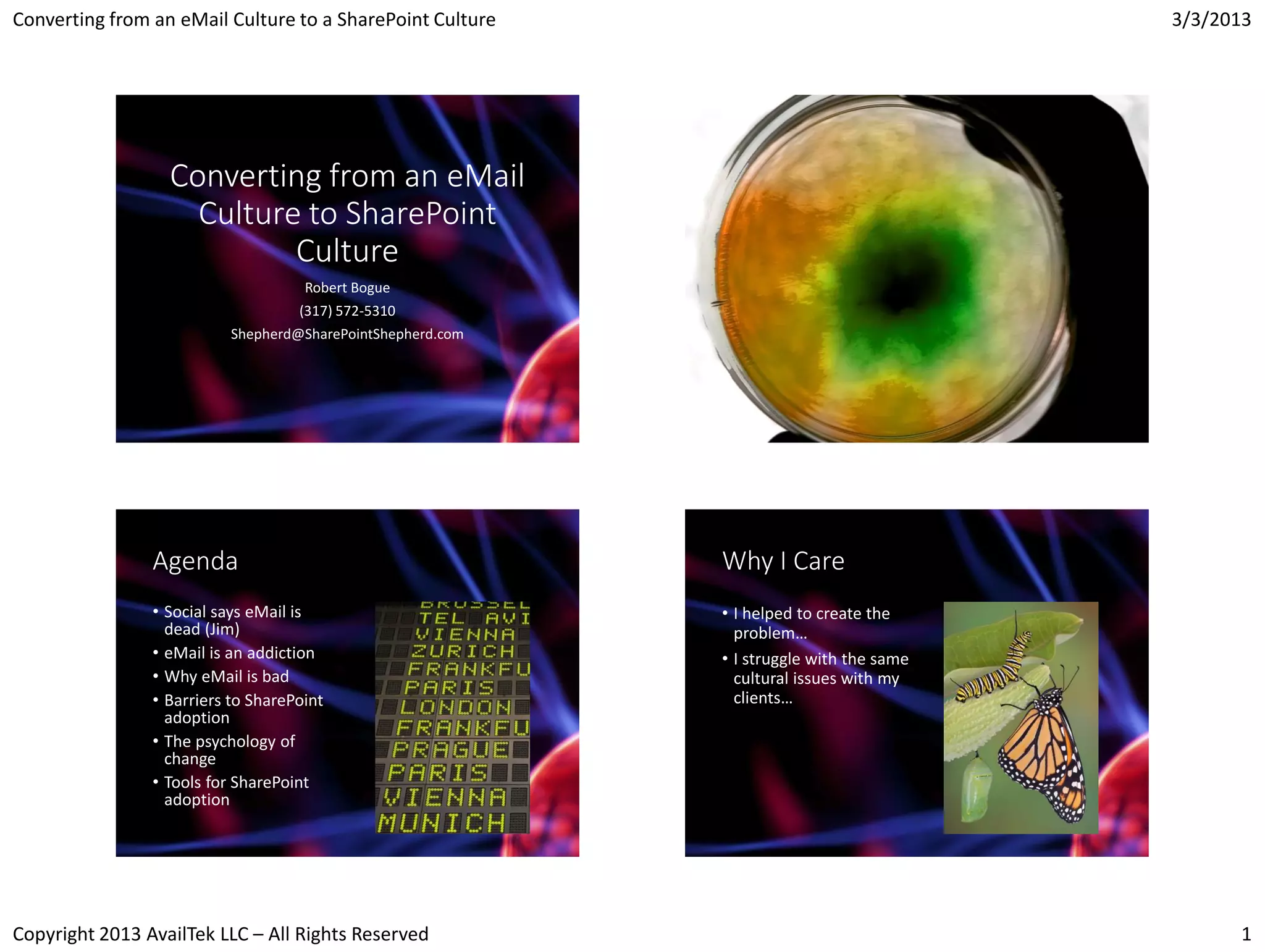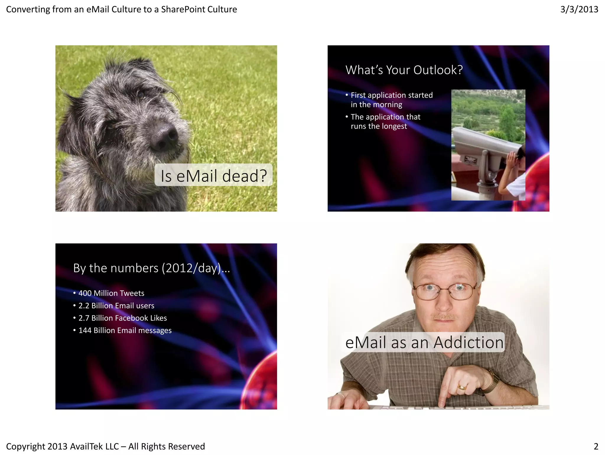 This document discusses converting from an email culture to using SharePoint. It notes that while email usage remains high, social media says email is dead. Email acts as an addiction for many due to expectations of rapid responses. Barriers to adopting SharePoint include lack of training and resources. Changing culture requires creating urgency, forming coalitions for change, and removing obstacles to build a new corporate culture anchored in SharePoint rather than email.
