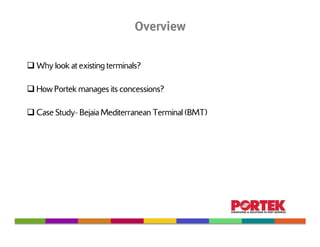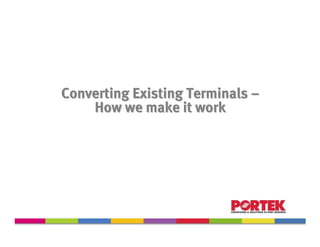 The document outlines the process and benefits of converting existing general cargo terminals into functional container terminals, emphasizing cost-effectiveness and minimal construction time. It highlights the case study of the Bejaia Mediterranean Terminal, detailing the planning, engineering, and operational considerations involved in the conversion. Portek's strategies for managing terminal upgrades and leveraging existing facilities to enhance operational efficiency are also discussed.
